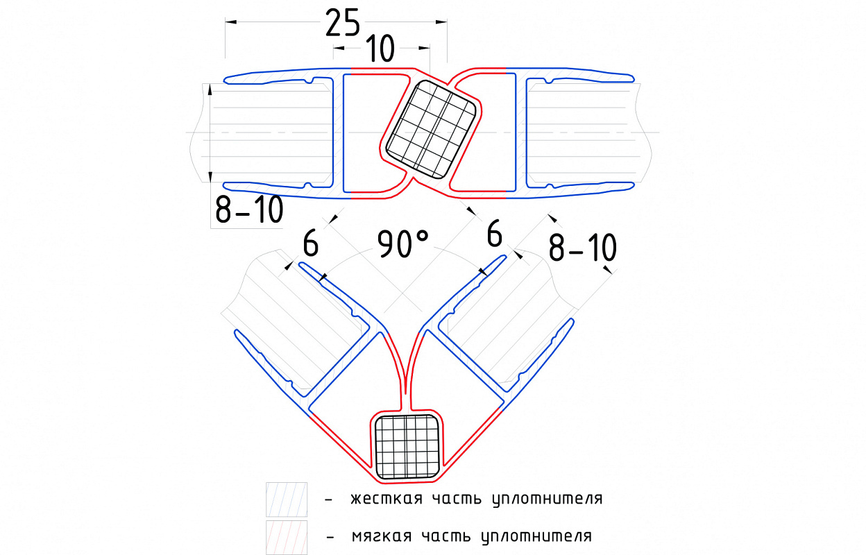 Уплотнитель для стекла 8мм, 90°, стекло-стекло 2,2 м.длина уса 25 мм t215y-8