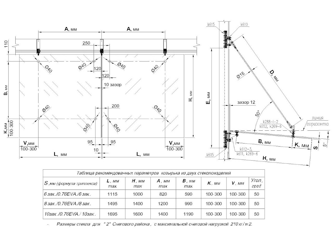 Применяется при монтаже козырьков из стекла, навесов над входом в магазин, козырьков над входом в подвал или над местом курения. Один из самых ответственных элементов крепления козырька. Отвечает за крепление конструкции непосредственно к зданию и несёт на себе весь её вес. Используется с рутелем k274-2либо k269-6.