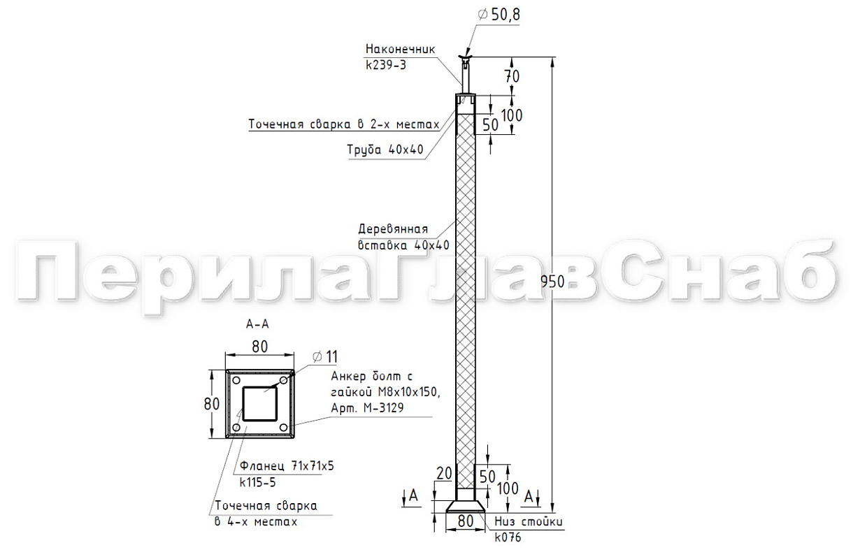 Готовая стойка 40х40х950 мм, деревянная, со вставками из нержавеющей стали 2х100 мм с 3 ригеледержателями k740-1-G купить в Омске