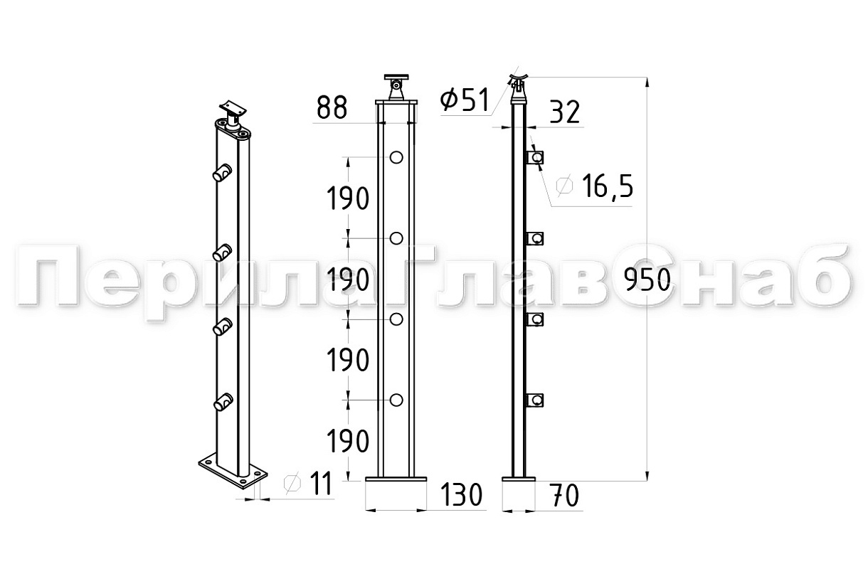 Стойка квадратная 40х40: 4 литых стеклодержателя, шлифованная, высота 950 мм AISI 304 k746-7 купить в Омске