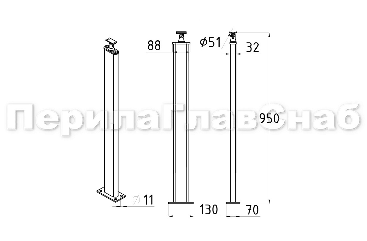 Стойка квадратная 40х40: 4 литых стеклодержателя, шлифованная, высота 950 мм AISI 304 k746-7 купить в Омске