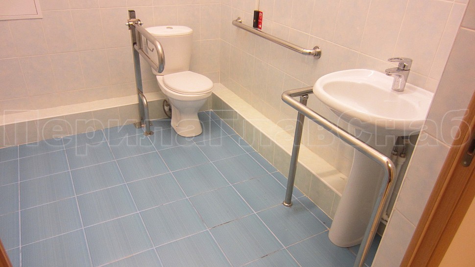 - Также были установлены поручни в ванную комнату и туалет для маломобильных групп населения: труба диаметром 38 мм, установлена на боковых крепежах к стене, на стойке с выходом в пол у раковины, и на квадратной стойке возле туалета.