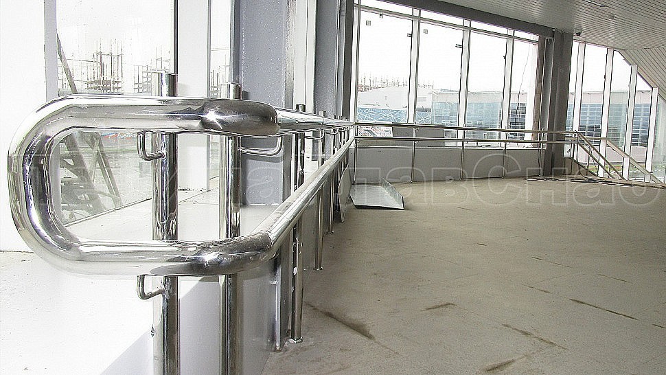 Для станции “Волгоградская” были спроектированы и установлены наружные ограждения высотой 900мм из прозрачного стекла триплекс 8+8мм, с поручнем диаметром 50мм из полированной нержавеющей стали с креплением к стеклу на выносном элементе. Стекло крепится сверху при помощи зажимного алюминиевого профиля. Крепление нержавеющих элементов ограждения между собой выполнено при помощи аргонно-дуговой сварки, длина швов — 2мм, с последующей зачисткой и полировкой.