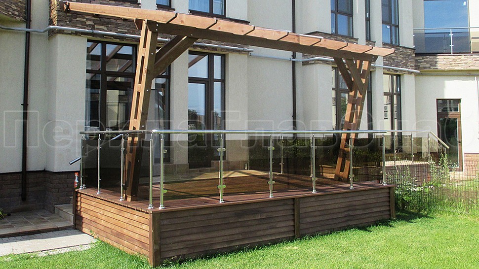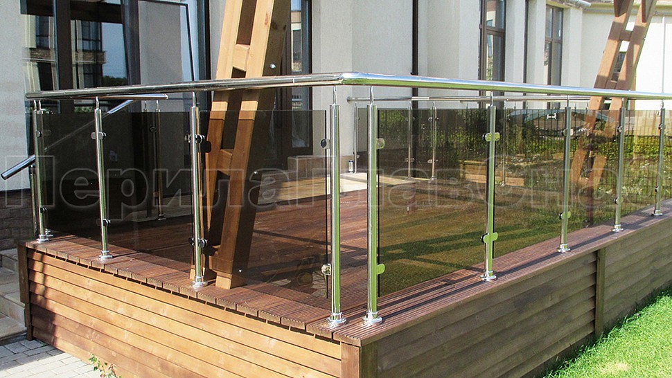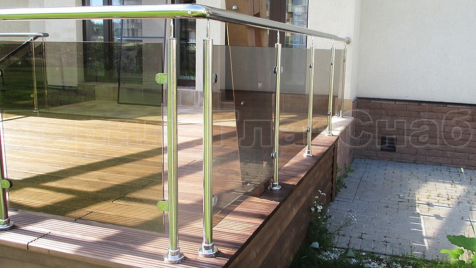 Такой заказ был принят и одобрен на монтаж ограждения террасы из полированной нержавеющей стали со стеклом, высотой 950 мм. Стойка труба диаметром 38 мм, низ стойки цанга, верх стойки штырь, с закаленным стеклом цвет "бронза" 8 мм и с полировкой кромок по периметру, с литыми стеклодержателями и порученем из полированной нержавеющей стали диаметром 50 мм. Стойки устнавливаются в горизонте с шагом кратно 900-1200 мм на фланце в деревянный настил на саморезах. Поручень завязан отводами диаметром 50 мм. Крепление нержавеющих элементов ограждения между собой точечная аргонно-дуговая сварка, длина швов 2 мм, с последующей зачисткой и полировкой.