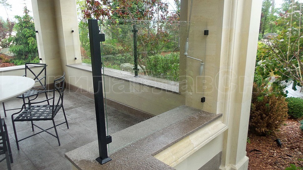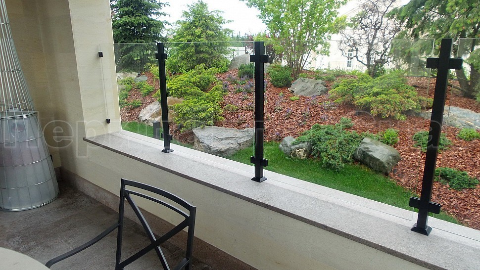 Нашими проектировщиками был проведен замер и предложен вариант конструкции, который очень подошел клиенту: восемь погонных метров ограждений со шлифованными стойками, окрашенными в черный цвет порошковым методом. Между стойками на зажимных стеклодержателях крепятся стекла толщиной 8мм, преданные закалке для большей прочности и безопасности конструкции. Так как