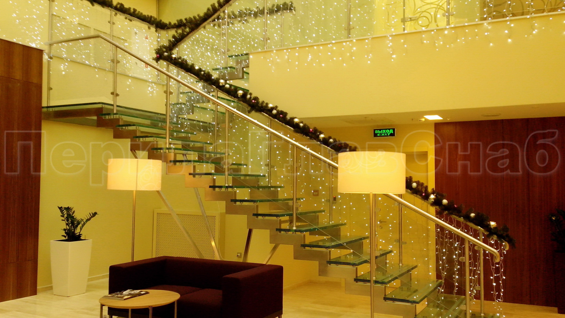 Ограждения лестниц на несущем стекле с подсветкой в Омске. Готовые проекты ПерилаГлавСнаб