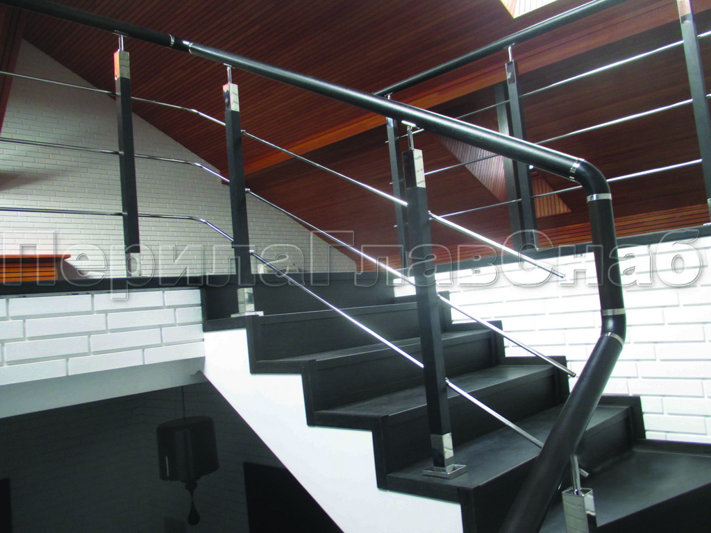 Ограждение лестницы на квадратных стойках с латунным поручнем в Омске. Готовые проекты ПерилаГлавСнаб