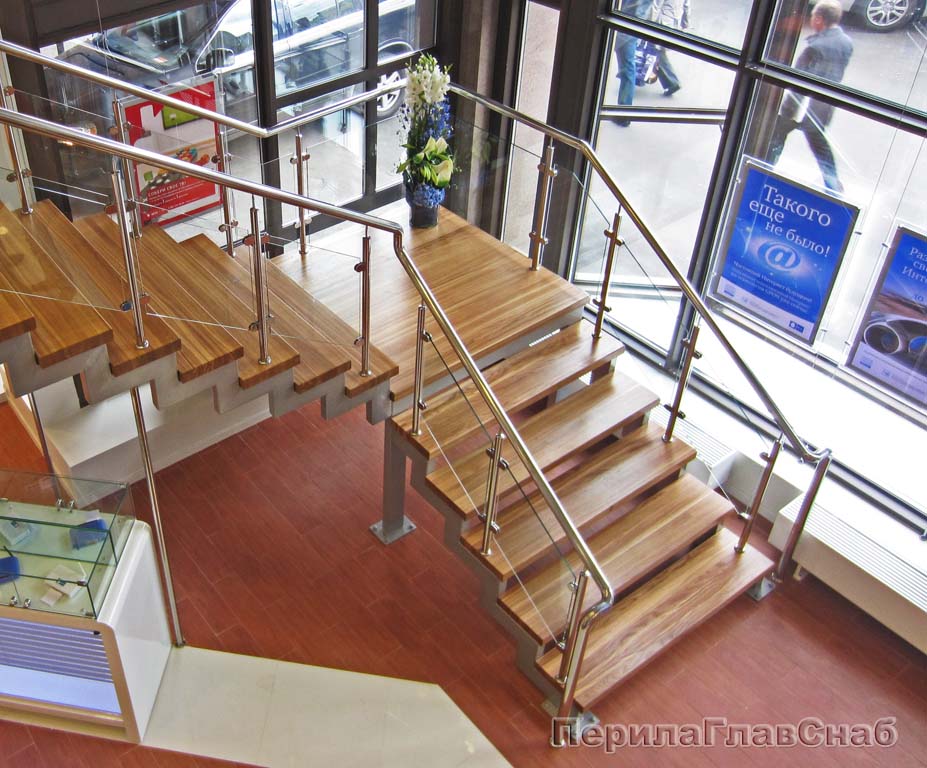 Ограждения лестницы без поручня с зажимными стеклодержателями и стойками в Омске. Готовые проекты ПерилаГлавСнаб