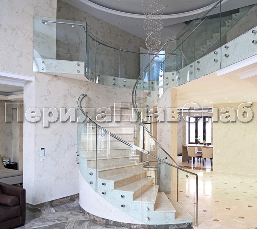• на выносных держателях к стеклу, прокатан по радиусу на балюстраде, имеет конструкцию винта на лестнице
