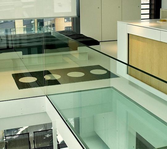 Стеклянное перекрытие из матового стекла на внутреннем балконе